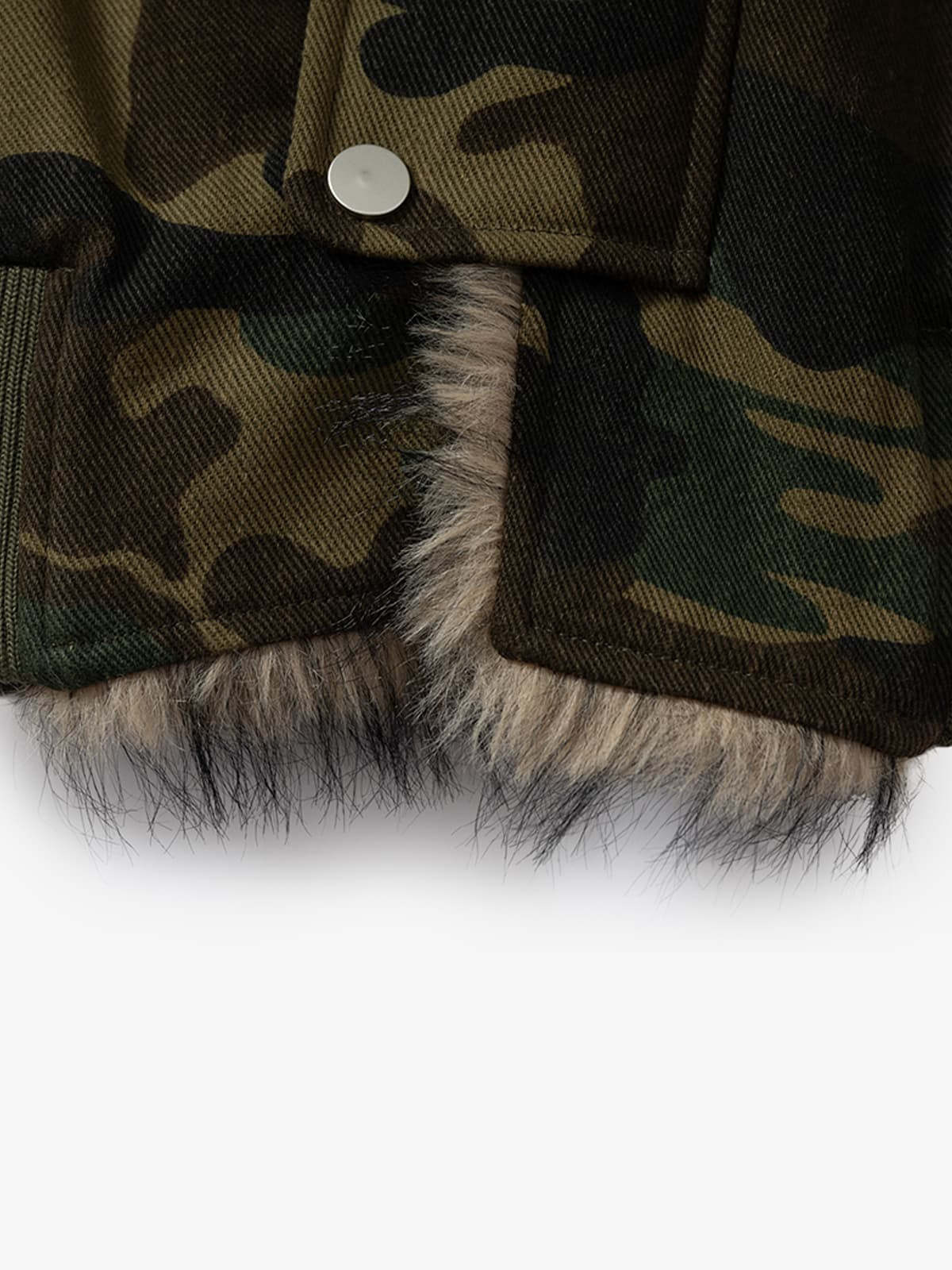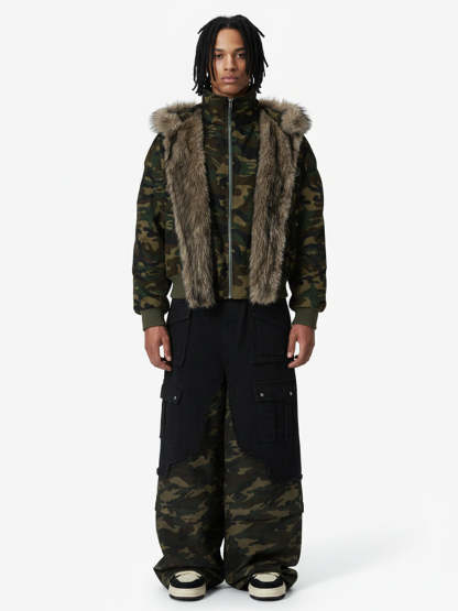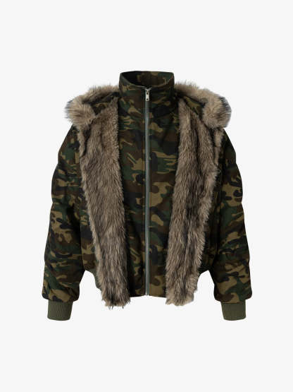 Vintage Camouflage Fur Collar Quilted Hooded Bomber Jacket